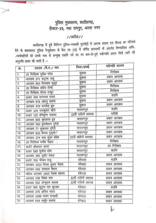 नक्सलियों की कमर तोड़ने में महत्वपूर्ण भूमिका निभाई थी। कई खूंखार हार्डकोर नक्सलियों को ढेर किया था। पदोन्नत होने वालों में DRG, CAF के जवान शामिल हैं। इसमें अधिकांश जवान धुर नक्सली इलाकों में तैनात हैं।