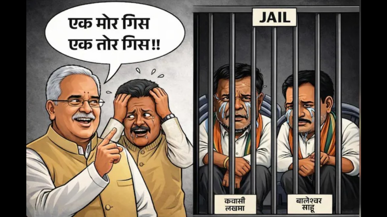 छत्तीसगढ़ बीजेपी के आधिकारिक फेसबुक पेज से साझा किए गए इस कार्टून पोस्टर में पूर्व मुख्यमंत्री भूपेश बघेल और विधानसभा में नेता प्रतिपक्ष डॉ. चरणदास महंत से मिलती-जुलती आकृतियां दिखाई गई हैं। पोस्टर में पूर्व आबकारी मंत्री कवासी लखमा और जांजगीर जिले के कांग्रेस विधायक बालेश्वर साहू को भी शामिल किया गया है। पोस्टर के माध्यम से यह दिखाने की कोशिश की गई है कि कांग्रेस के बड़े नेताओं के करीबी लोग भ्रष्टाचार के मामलों में जेल में हैं।